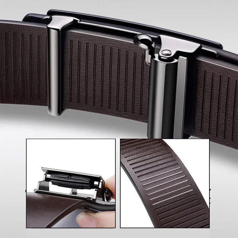 INNOVATIV TANNLØS SELV-LÅSENDE DESIGN - Dette beltet har en avansert tannløs selv-låsende mekanisme, som gir uovertruffen bekvemmelighet og sikkerhet. I motsetning til tradisjonelle belter med hakk, tillater den tannløse designen presis og uendelig justerbar størrelse.
