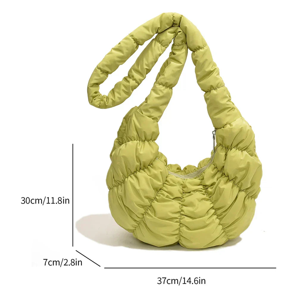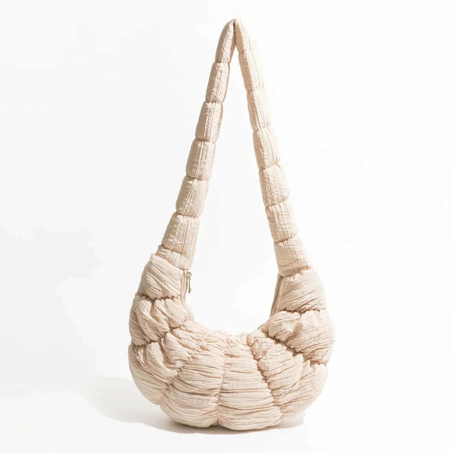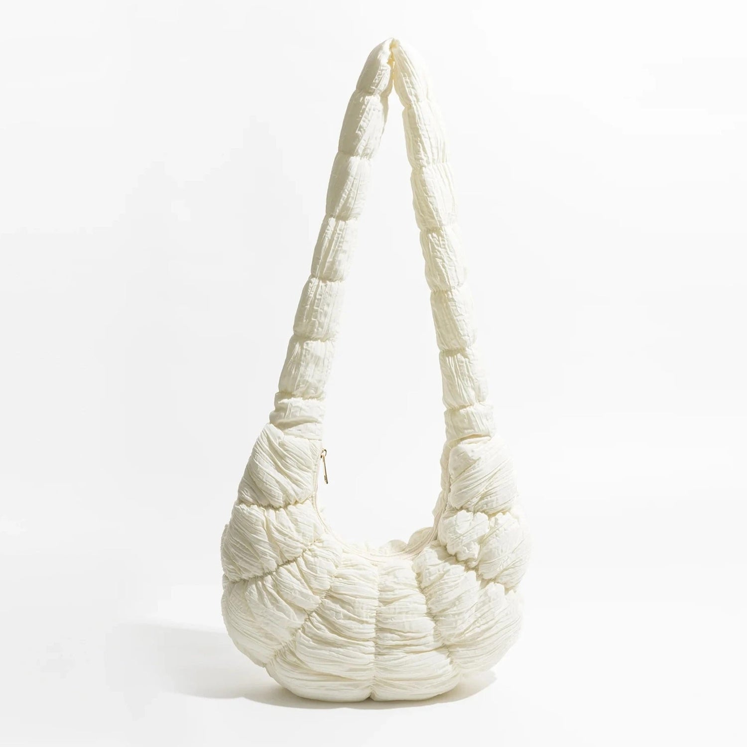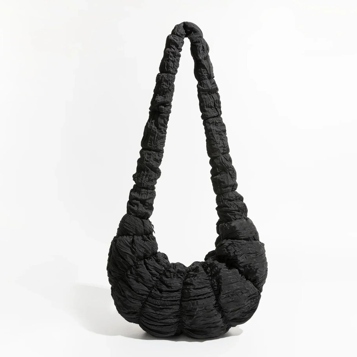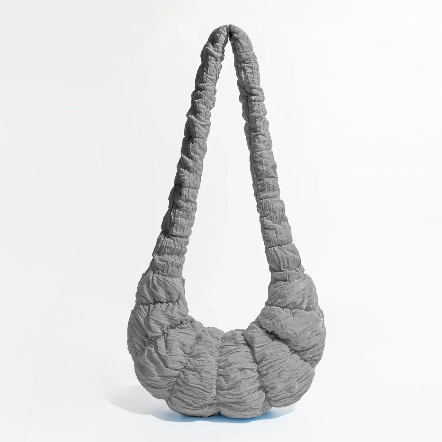 Utforsk en elegant og moderne stil med vår Puff Croissant Skulderveske. Dette romslige tilbehøret, tilgjengelig i både liten og stor størrelse, er designet for å ligne på en myk croissant. Ideell for dagligdags bruk eller reise, er den laget av lette og behagelige materialer som sikrer at du har det komfortabelt mens du er i bevegelse.