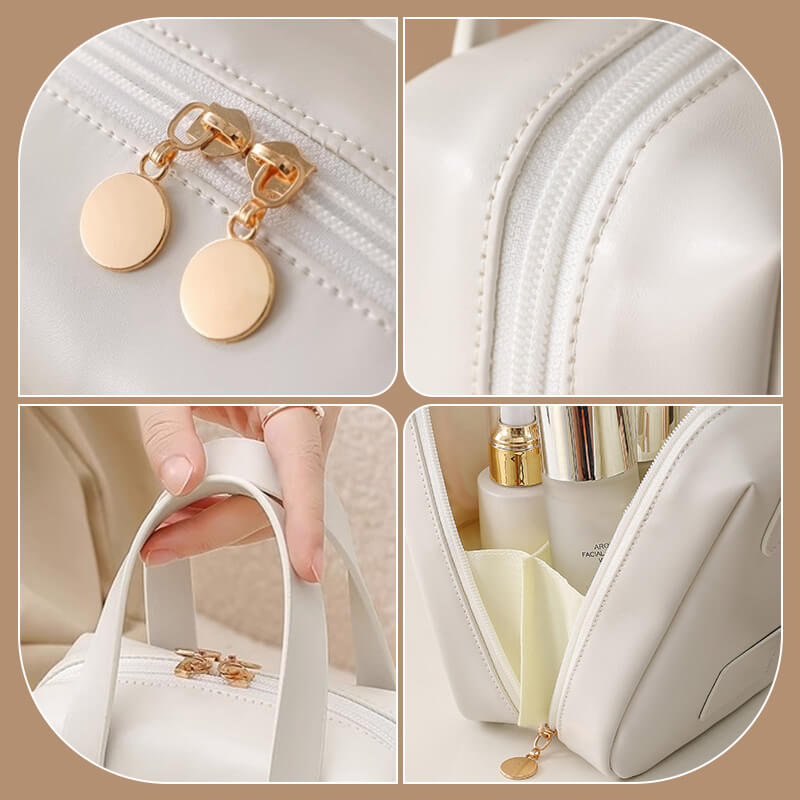 Denne robuste vesken er laget av lær og materialer av høy kvalitet, og har oppbevaringsrom som holder orden på alle skjønnhetsproduktene dine.