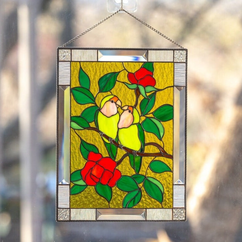 🦜Glassmaleri-vinduet med kjærlighetsfugler er et imponerende tillegg til ethvert hjem. Dette kunstverket kan plasseres i et vindu eller henges på en vegg. Glassmaleri-solfangeren leveres med kjede og vindusholder, noe som gjør det lett å vise panelet hvor som helst.