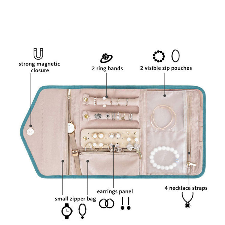 Fem forskjellige rom: Inkluderer en avdeling for ringer med utvidede bånd, en holder for øredobber, en pose for halskjeder, en gjennomsiktig glidelåspose med ett rom, og en lang glidelåsseksjon.