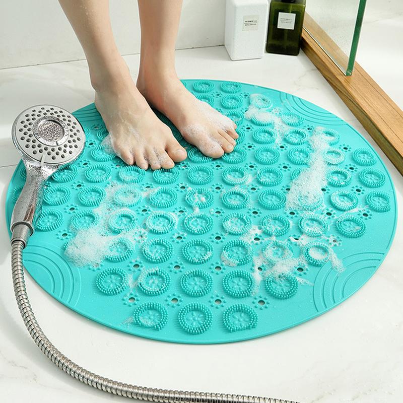Rutsjefri og Behagelig: Overflaten på den sikre dusjmaten har avrundede rutsjefrie ringer, mens undersiden er utstyrt med sugekopper for et solid grep på gulvet. Denne rutsjefrie badematten gir også en behagelig massasjeopplevelse, noe som gjør den ideell for både barn og eldre.