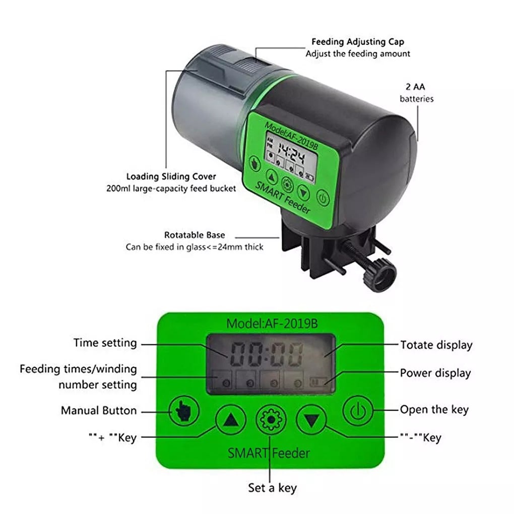• STOR KAPASITET: Med en kapasitet på 200 ml, har fôreren godt med plass til mat som kan brukes til å fôre fisken din i ditt fravær. Den justerbare matdøren gjør at du kan bestemme hvor mye mat som skal slippes ut ved hver fôring.