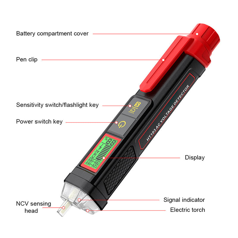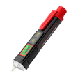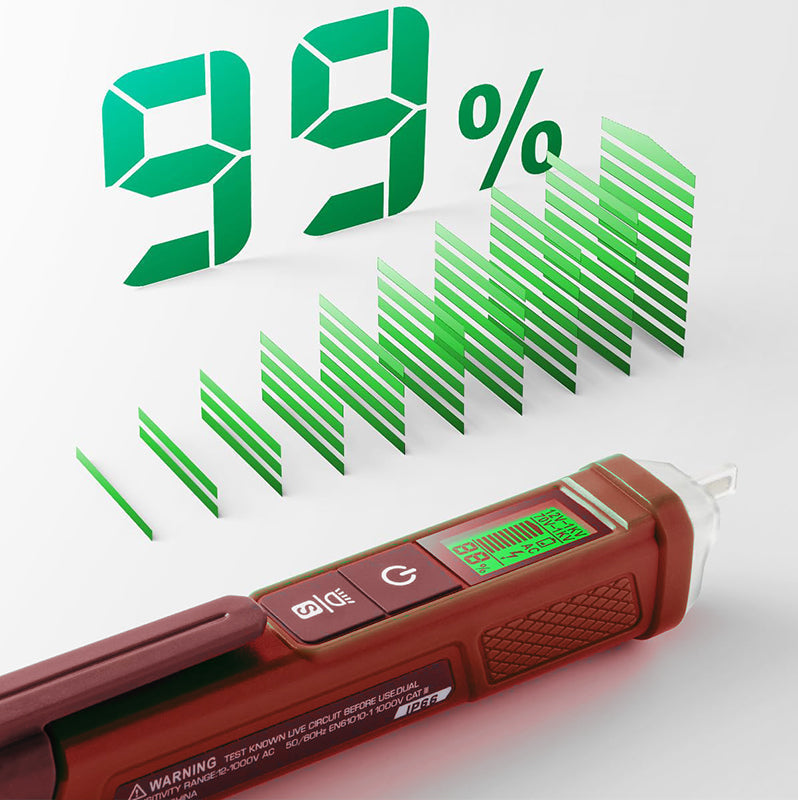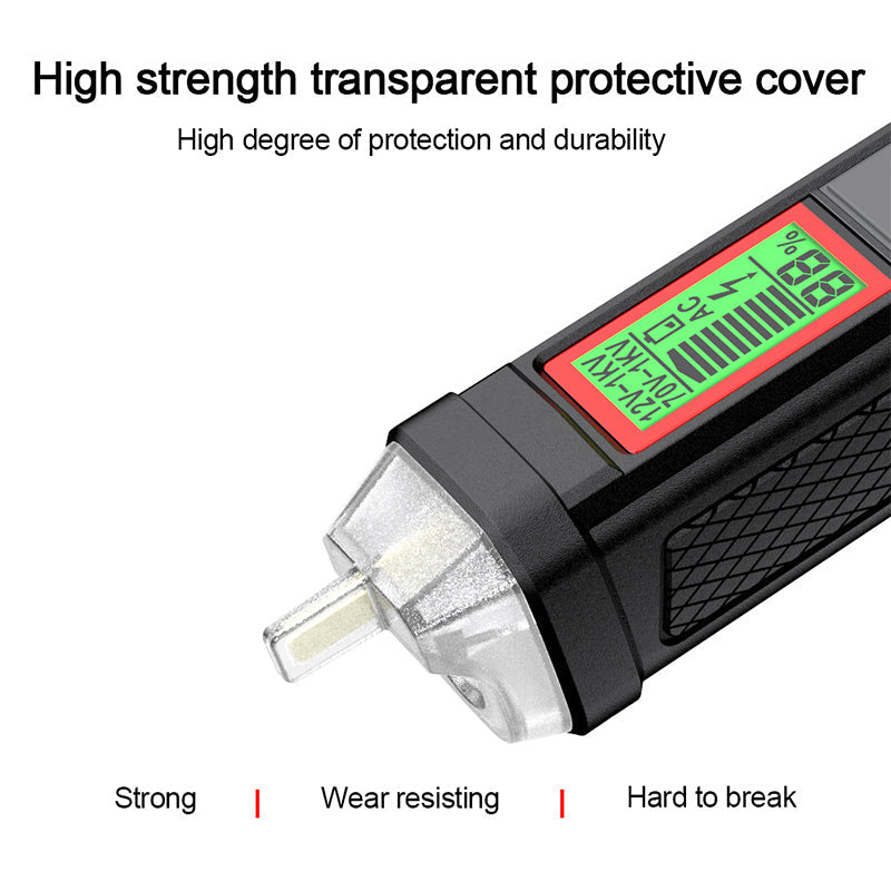 Når spenning oppdages, lyser spissen i rødt, skjermen tennes i rødt, og en alarmlyd går av. Intensiteten av alarmen og lyset øker med høyere spenningsnivåer. Dette verktøyet er ideelt for å måle vekselstrøm i ledninger, kabler, sikringer, lamper, brytere og stikkontakter som ikke er blitt ombygget.