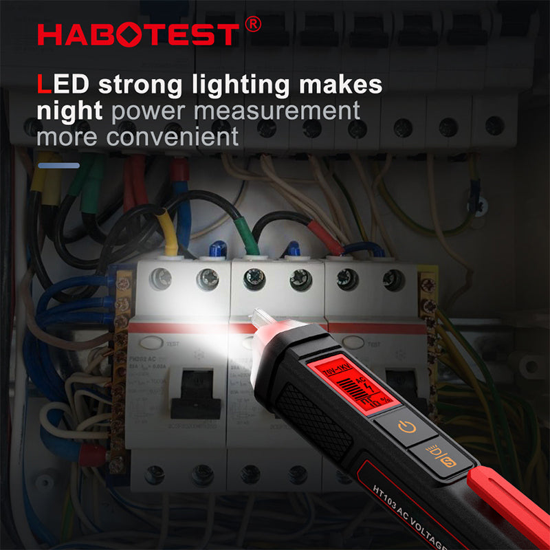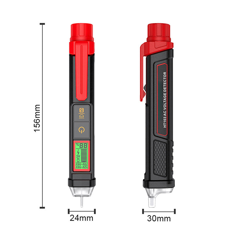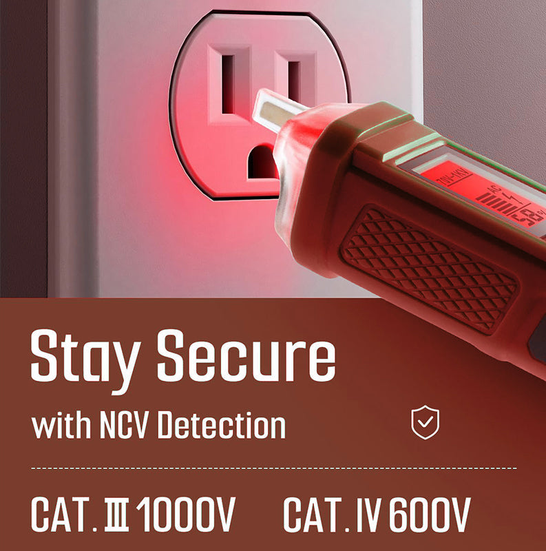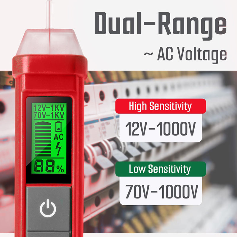 Denne måleren kan håndtere et bredt spekter av spenningsnivåer, med et deteksjonsområde på 12-1000V i høy følsomhet og 70-1000V i lav følsomhet. Bruk lavinnstillingen for oppgaver som motoriserte gardiner, vanningssystemer og lavspente utendørsbelysninger. Du kan bytte mellom følsomhetsinnstillinger ved å trykke på S-knappen, hvor høy følsomhet er standardmodus.