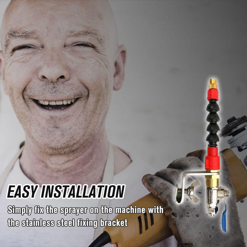 Fest enkelt sprøyten på maskinen med rustfritt stålfeste, deretter fører du vannrøret gjennom mutteren på sprøytens hale, sett det inn og stram det. Deretter kan du begynne å jobbe uten at støvet blokkerer synsfeltet ditt.