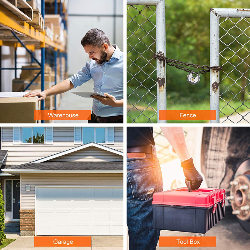 Bruk av hengelås: Perfekt for å trygge containere, lagringsområder, garasjer og verktøyboder, tilhengere, mobile salgspunkt, utendørsdører, lagerbygninger, logistikkinnganger og kjøretøy i bevegelse, blant annet.