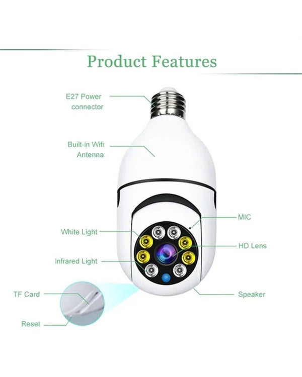 Kameraet kan enkelt plasseres i en standard E27-sokkel (110V~240V) – INGEN EKSTRA INSTALLASJON BEHØVES. Etter montering, koble kameraet til ruteren din og bruk appen for raskt å konfigurere kameraet.