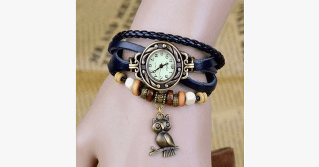 Hjemix | Ugle Vintage Wrap Klokke med Boho-Chic Stil Armbånd - Vevd mansjett-stil armbåndsur for et funky utseende!