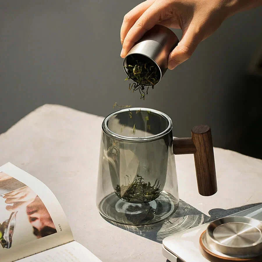 Denne tekoppen utmerker seg med sin karakteristiske form som fremhever dens unike sjarm. Det naturlige treskjeftet sikrer et komfortabelt grep og gir en organisk følelse til te-nytingen din. Det praktiske lokket forbedrer varmebevaringen og garanterer at teen din brygges perfekt.