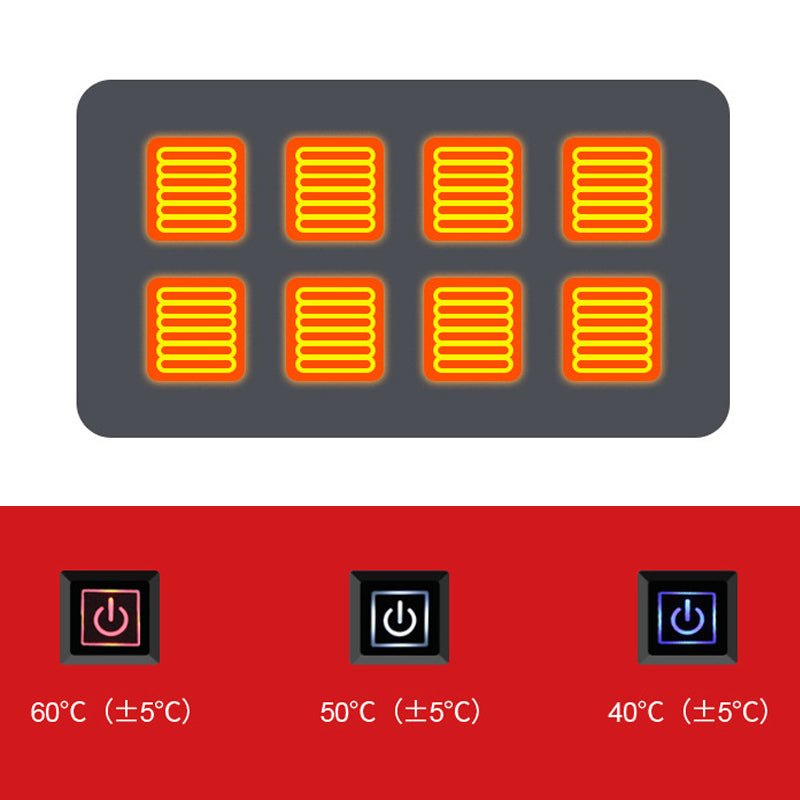 - Rask Oppvarming: Utrustet med tre temperaturinnstillinger (35°C-60°C), kan du enkelt tilpasse varmen etter dine behov med bare én knapp. Den hurtige oppvarmingsfunksjonen fjerner kulden og gir deg komfort på kort tid.
