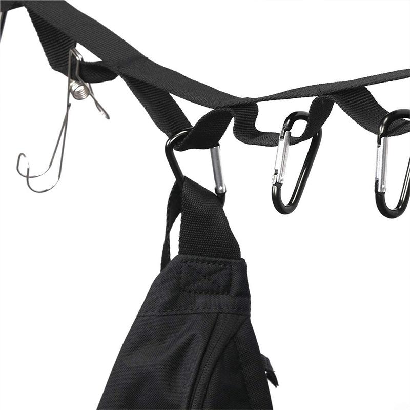 - Varierte løkker, kroker og klips: Stroppen har 19 løkker og leveres med 8 karabiner samt 4 klips. Løkkene forhindrer at krokene glir til midten, noe som gir deg muligheten til å henge campingverktøyene på en praktisk måte.