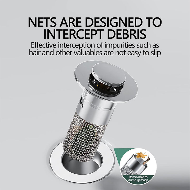 - Innovativ Konstruksjon: Denne pop-up avløpsfiltreringen presenterer et banebrytende design i motsetning til tradisjonelle avløpsløsninger (som kun er en enkel plugg festet til en kjede)! Med et lett trykk på lokket kan du enkelt bytte mellom to funksjoner: plugg (for å holde på vannet) og filter (for å lette vannavløpet).