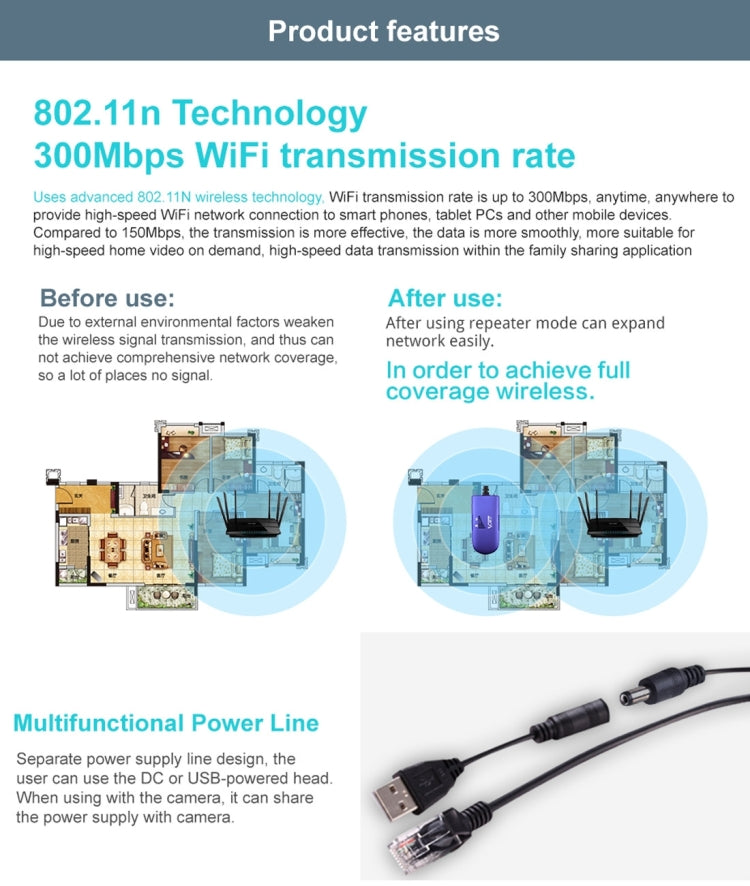 2. Kompatibel med Wi-Fi-overføringsprotokoller 802.11b/g/n, med en overføringshastighet på 300Mbps.
