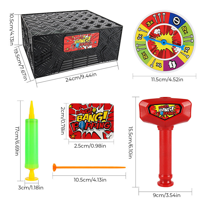 ă4 enkle trinn for Ă„ spilleă Fest de fargerike klistremerkene til hammeren og boksen, blĂ„s opp ballongen og plasser den i boksen, snurr hjulet for Ă„ ta tur, og bruk hammeren til Ă„ slĂ„ neglen uten Ă„ fĂ„ ballongen til Ă„ sprekke.
