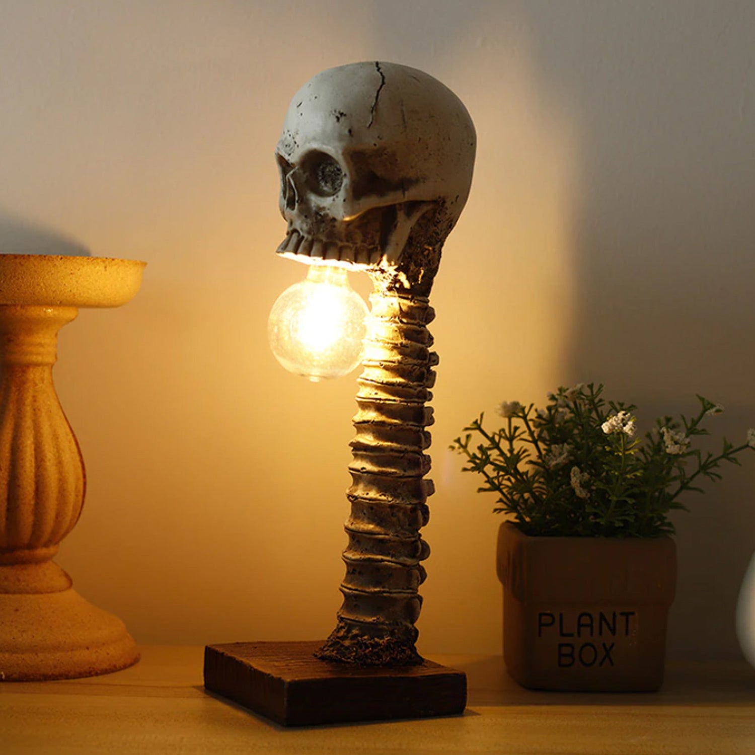 Denne lampen som har en hodeskalle og ryggrad som design, er perfekt for de som elsker det ukonvensjonelle og skumle. Den presenterer en realistisk hodeskalle sammen med en ryggrad og virvler, og tilfører en kjølig stemning som helt sikkert vil fange oppmerksomheten til alle som ser den. De opplyste øyehulene, som drives av LED-lamper, gjør den til et fantastisk element for å skape en uhyggelig atmosfære hvor som helst.